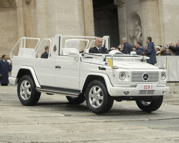 Per il ruolo istituzionale del pontefice si ricorre (foto a,b) alla Mercedes-Benz S 500 serie W 221 che dal 2008 è subentrata alla versione S 500 (W 220) del 2004.