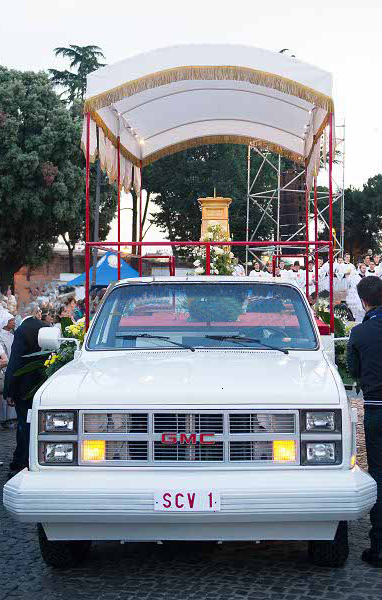 Nel Garage pontificio vi è un altro veicolo con targa S.C.V. 1 finora a me sconosciuto: si tratta di un imponente pick-up americano GMC "Sierra", col cassone adattato a mo' di piattaforma, attualmente parcheggiato nei locali dell' Autoparco (foto p). Si tratta di un veicolo utilizzato da papa Giovanni Paolo II in occasione del suo viaggio in Canada nel 1984, arrivato poi in Vaticano come dono personale al pontefice. Le uniche immagini del GMC in servizio si riferiscono alle festività del Corpus Domini celebrate a Roma il 19 giugno 2014 e il 4 giugno 2015: in entrambi i casi Il mezzo fu impiegato nell' ambito della processione lungo via Merulana per il trasporto di una statua consacrata da san Giovanni in Laterano a santa Maria Maggiore. In entrambe le occasioni papa Francesco preferì non essere a bordo del mezzo.